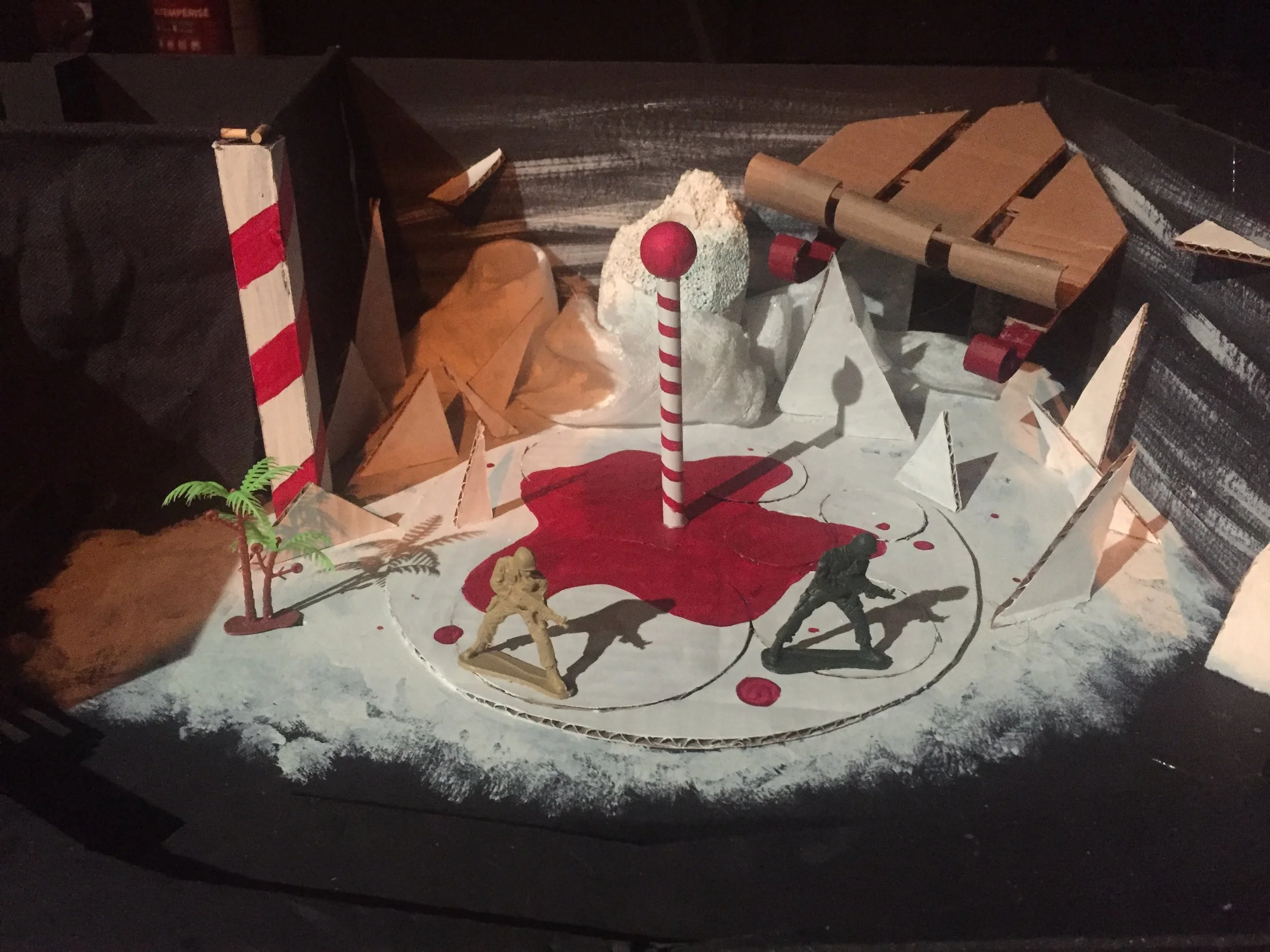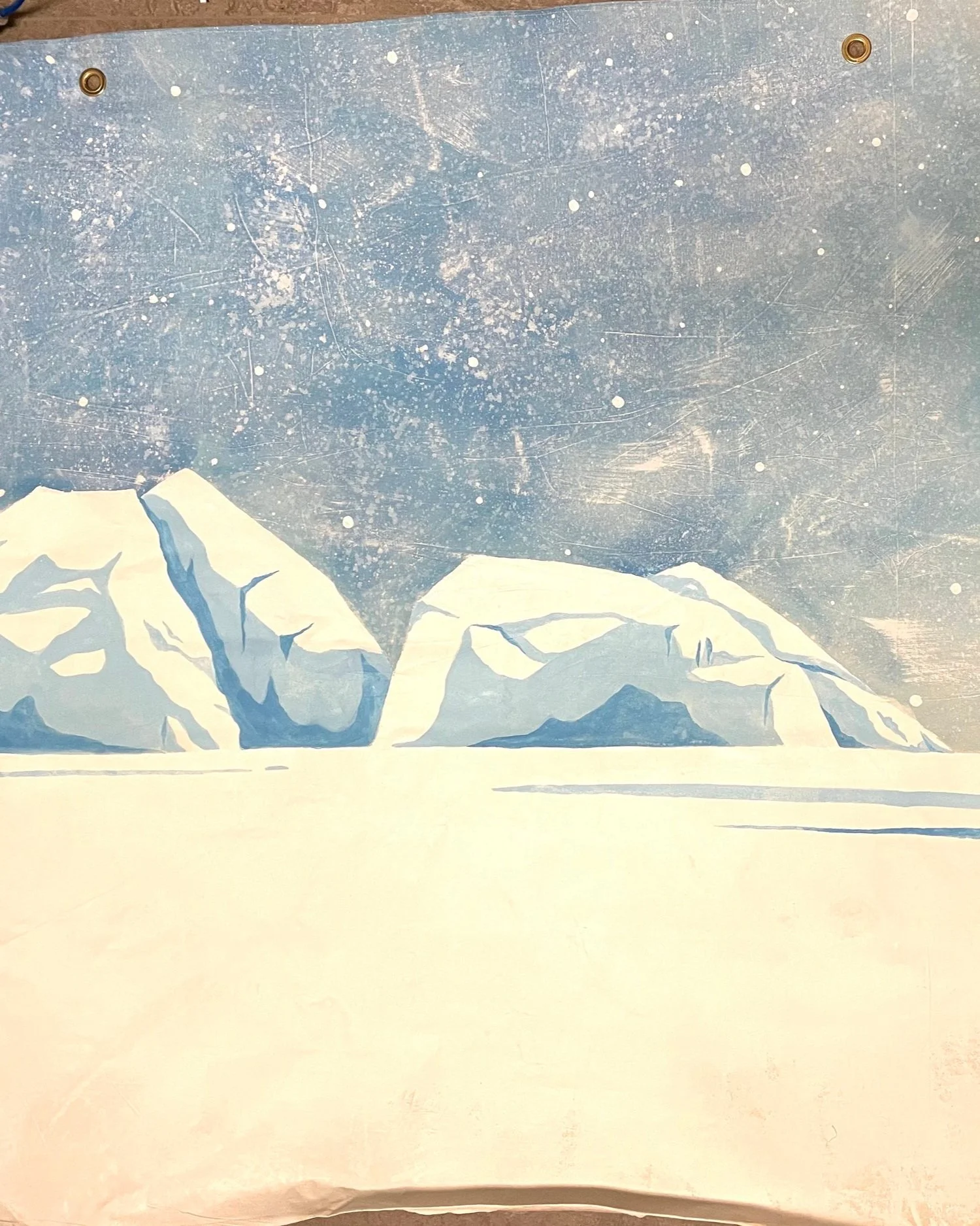 A mini skidoo (then polar bear, orca, and seal) chase sequence, done with a scrolling 2’x 1’6” paper backdrop (Right) and mini Popsicle stick puppets (Bottom Left).